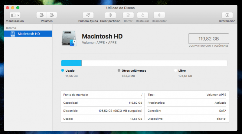 La primera parte de este tutorial, es exactamente igual a la que se ha descrito anteriormente (en la parte 3). No voy a extenderme más en este aspecto, ya que la elección de la distro, la arquitectura, y la creación de los medios de instalación son exactamente iguales a los ya comentados (eso sí, el disco de arranque puede ser, o un DVD, o un USB especialmente preparado para el arranque bajo EFI; ojo con esto). Sin embargo, aquí es dónde va a empezar a diferir el procedimiento ya que, a la hora del particionado de los discos duros, es necesario realizar este proceso de forma manual en la Utilidad de Discos de Mac OS, el cual, te aparecerá tal que así (al menos, es como lo dispongo en mi caso, con macOS High Sierra 10.13.4):