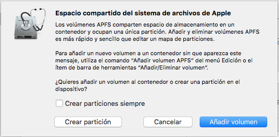Si tienes una unidad de disco duro o SSD formateada en HFS+, estás de suerte. Simplemente le das a Crear Partición, le das el tamaño que prefieras, le das el formato FAT32 (importante), y, como diría cierto personaje de la televisión, “ala, aparcao”. Sin embargo, con el nuevo sistema de archivos introducido en macOS High Sierra (APFS), las unidades de disco duro se agrupan en “volúmenes lógicos”, por lo que te saldrá este aviso si intentas crear una partición en un disco de este estilo:
